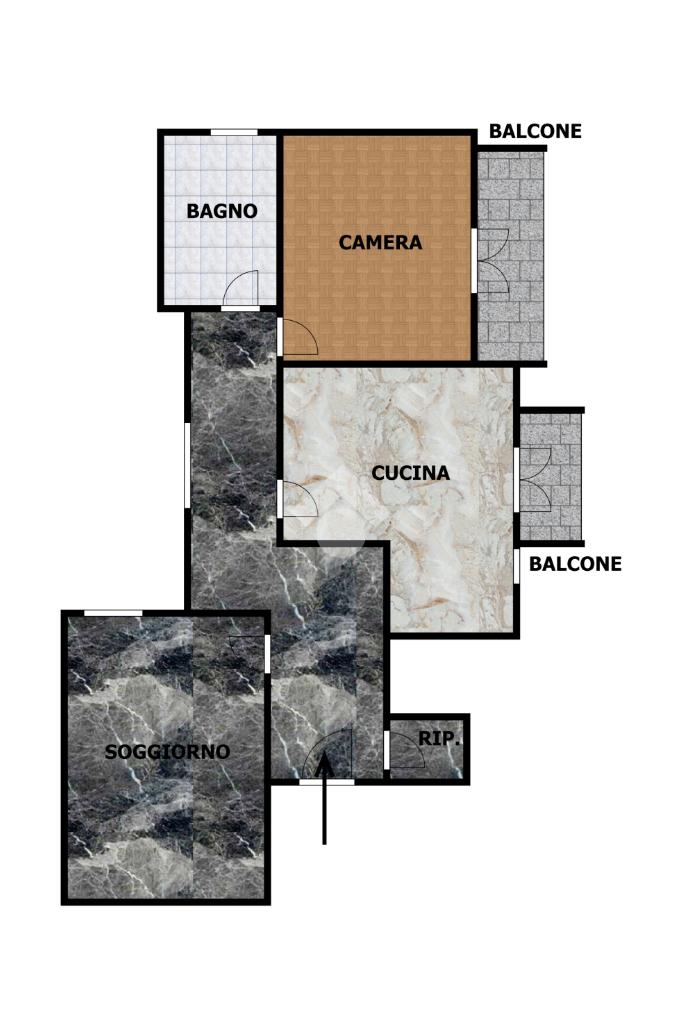 L'immobile, in tripla esposizione, è composto da ingresso, soggiorno, cucina abitabile, camera matrimoniale, bagno finestrato e ripostiglio, oltre due balconi accessibili rispettivamente da cucina e camera.